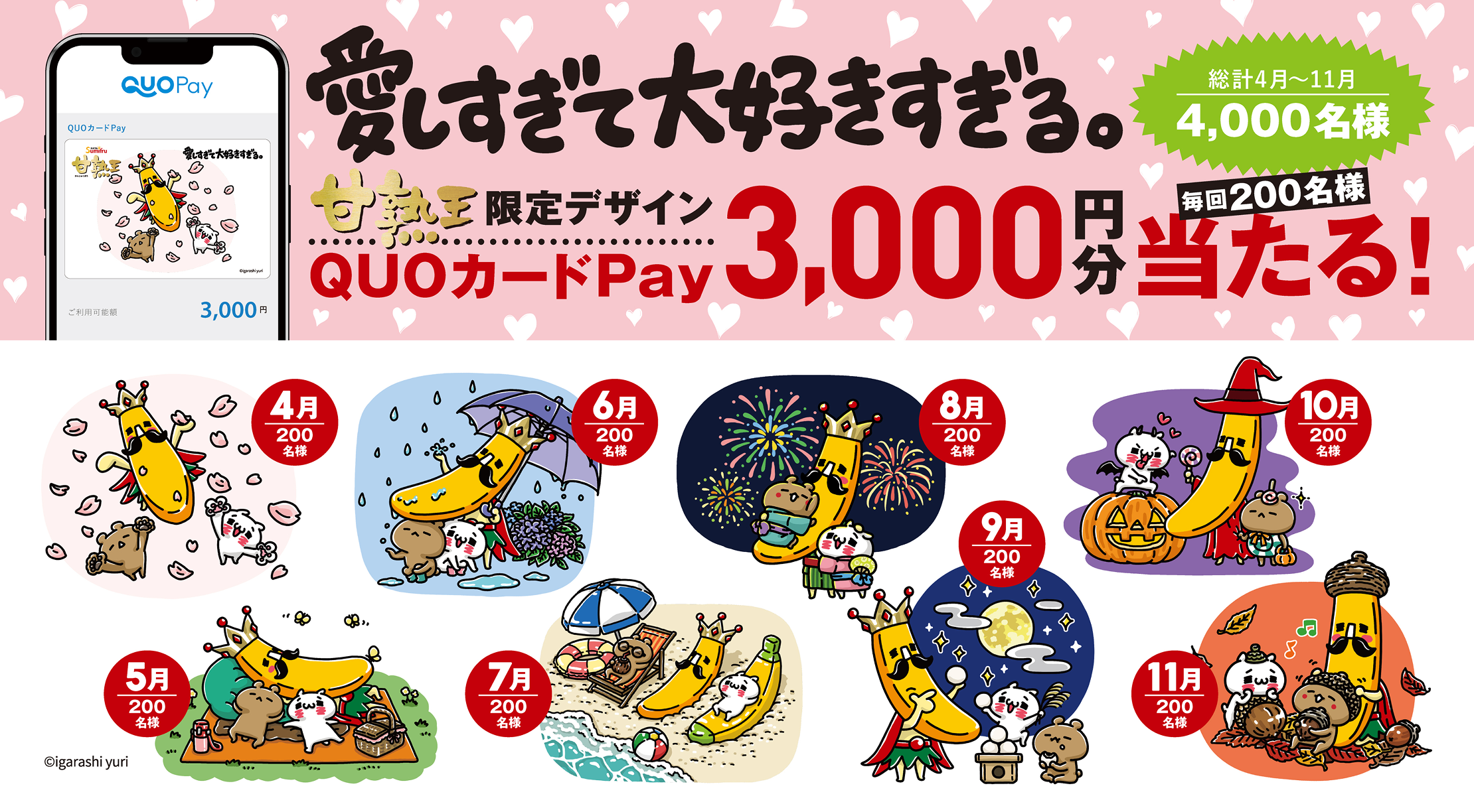 - 「『 愛しすぎて大好きすぎる。』甘熟王限定デザインQUOカードPay」当選者様には、各回応募締め切り3週間後以降、ご登録いただいたメールアドレスにギフトコード付きメッセージを順次配信予定でございます。