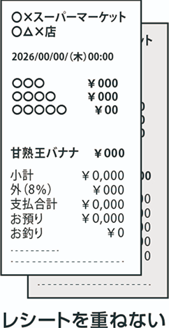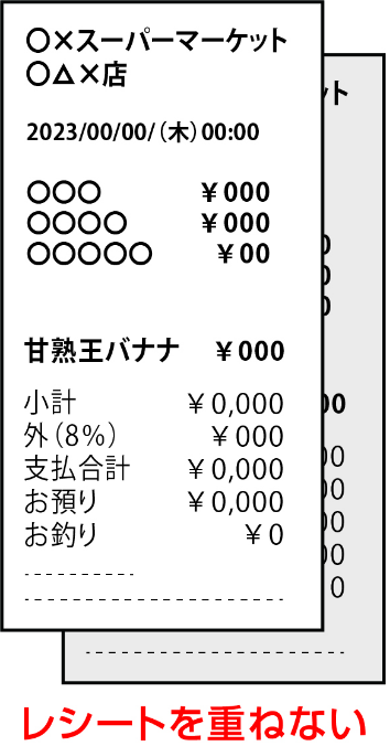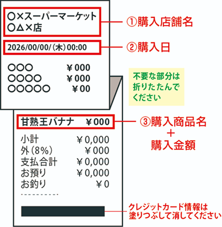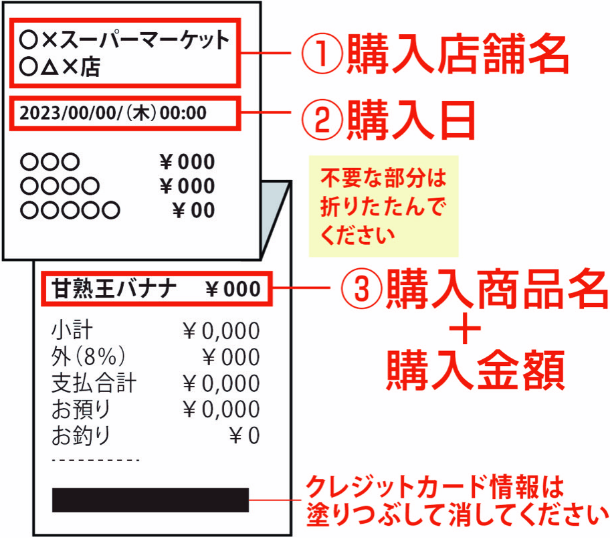 - レシートが長くて1枚の画像として撮影できない場合は、対象商品以外の記載部分を折り曲 げて撮影してください。ただし、「購入日」「購入バナナ商品名」「バナナ購入価格」が確認出来るようにご注意ください。