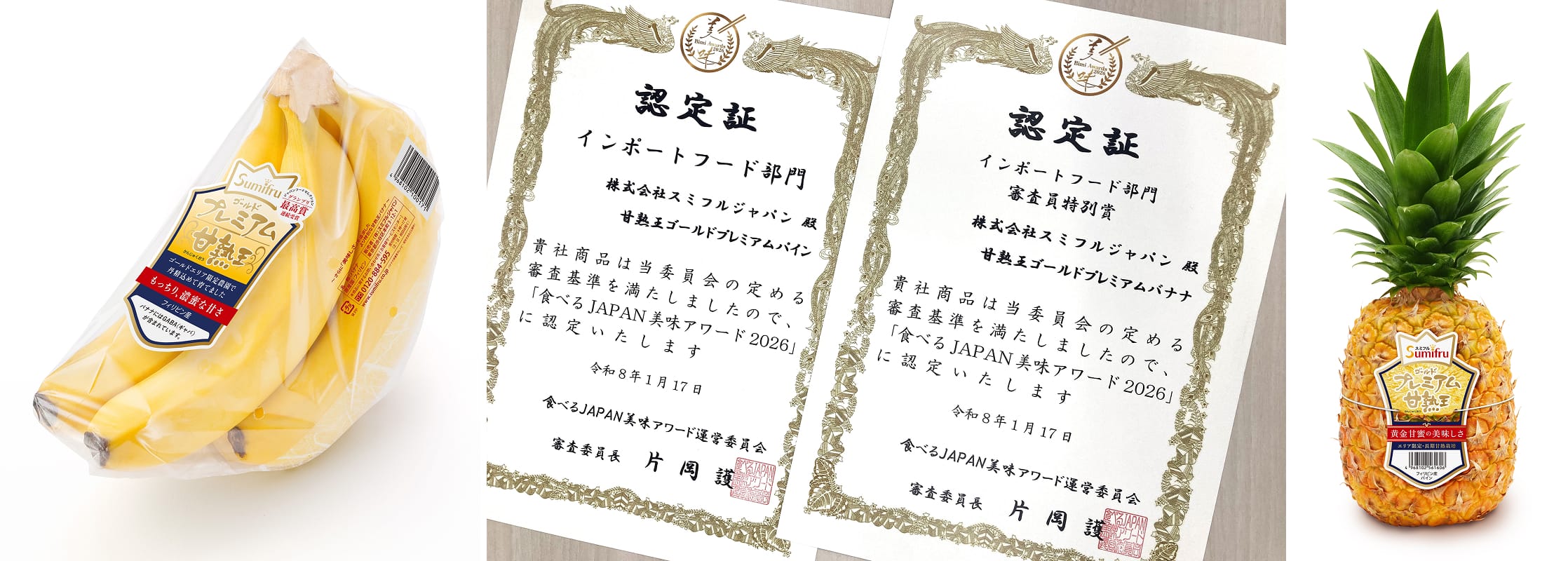 スミフルの甘熟王ゴールドプレミアムシリーズが、“美味しいバナナ” “美味しいパイン”として認定されました。