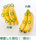 皮ごとすべて分析します。食品の残留農薬検査は、厚生労働省が定める公定法と呼ばれる試験法で行います。公定法は、検査結果のバラツキを少なくするために、農薬の種類や食品ごとに試験法、検体の調整方法、使用する分析機器、検査手順などが細かく定められています。この公定法では、バナナの検査部位は「果柄部を除去したもの」と設定されています。また残留農薬基準も果柄部を除去しただけの皮ごとのバナナに設定されています。バナナの場合通常皮を食べることはありませんので、大変厳しい検査方法といえます。 (日本バナナ輸入組合HP・FAQより引用)