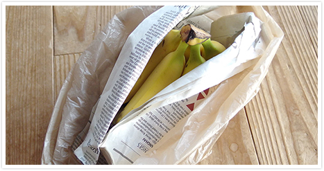 まず、バナナの袋を外し、新聞紙や厚手のタオル等で包み、さらに包んだバナナをビニール袋に入れます。その後、比較的暖かい、人が出入りするリビングなどで保存してください。